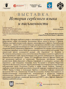 У оквиру прославе Дана словенске писмености на Катедри словенске филологије Државног универзитета у Санкт Петербургу 16. маја 2014. године приказана је изложба История сербского языка и письма и представљен је пројекат Преводилачке радионице Тршић. Публици су се обратили председница Асоцијације за међународну сарадњу Маргарита Фјодоровна Мудрак, заменик шефа Катедре за словенску филологију доцент Зоја Кузминишна Шанова, доцент Катедре историје словенских и балканских земаља Владимир Владимирович Василик, студенткиње српског одсека Полина Беловал, Александра Пријма и Ирина Гучкова. Студенткиње Александра Пријма и Ирина Гучкова у јуну 2013. године учествовале су у Преводилачкој радионици Тршић, заједничком пројекту Центра за културу „Вук Караџић“ из Лознице, Института за књижевност и уметност из Београда и Музеја језика и писма из Тршића, и превеле су изложбу Српско писмо и језик кроз историју ауторке мр Дајане Ђедовић на руски језик. Са циљем промоције српске културне баштине и српског као страног језика у иностранству, овај пројекат и програм радионице осмислила је и са страним студентима славистике радила је мр Драгана Грбић, а лектуру превода на руски језик урадила је лекторка на Катедри словенске филологије, Драгана Дракулић-Пријма.