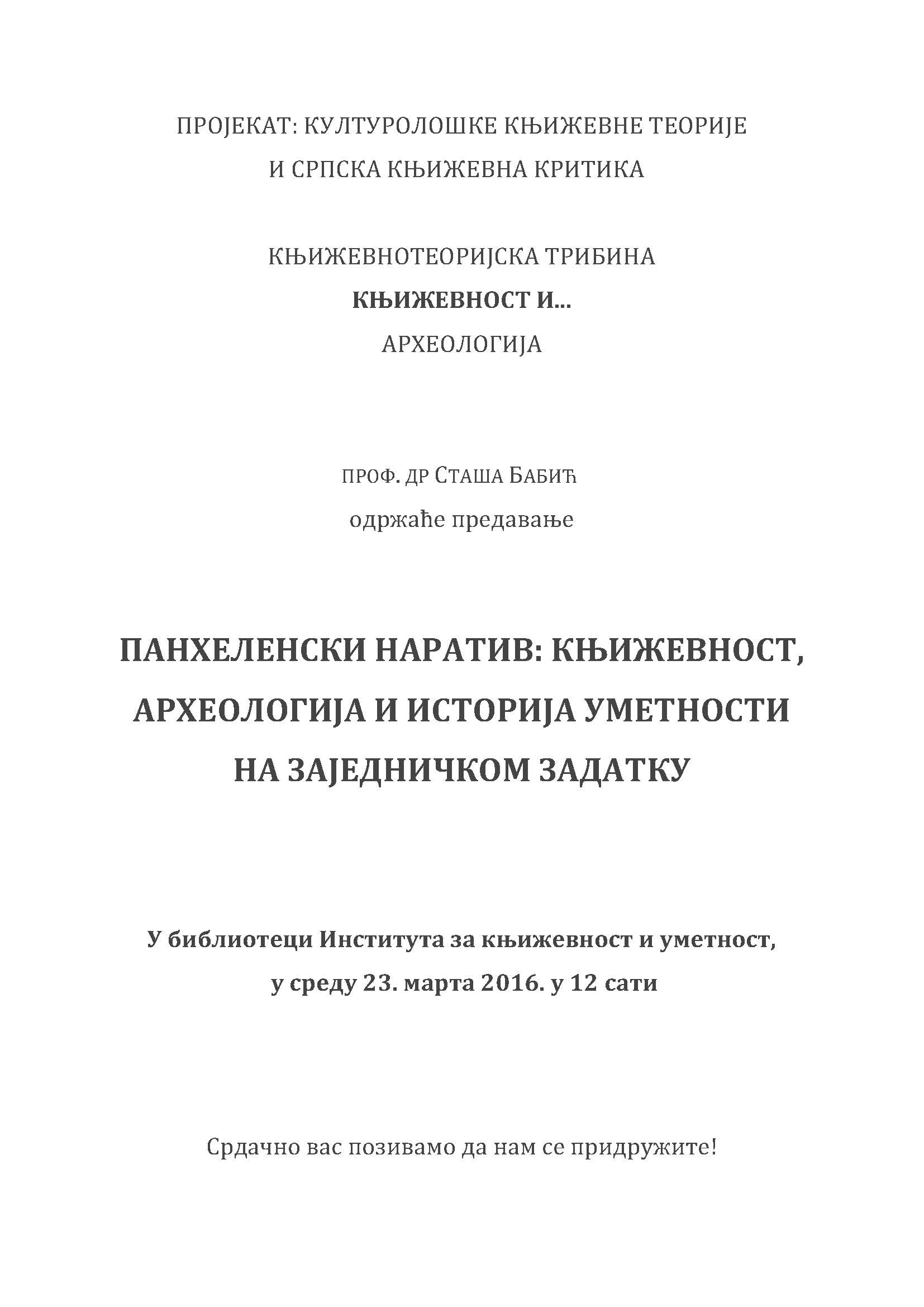 | 23. март | проф. др Сташа Бабић: „Панхеленски наратив: књижевност, археологија и историја уметности на заједничком задатку“. Извештај о трибини можете погледати овде, a предавање можете послушати на следећем линку. |
