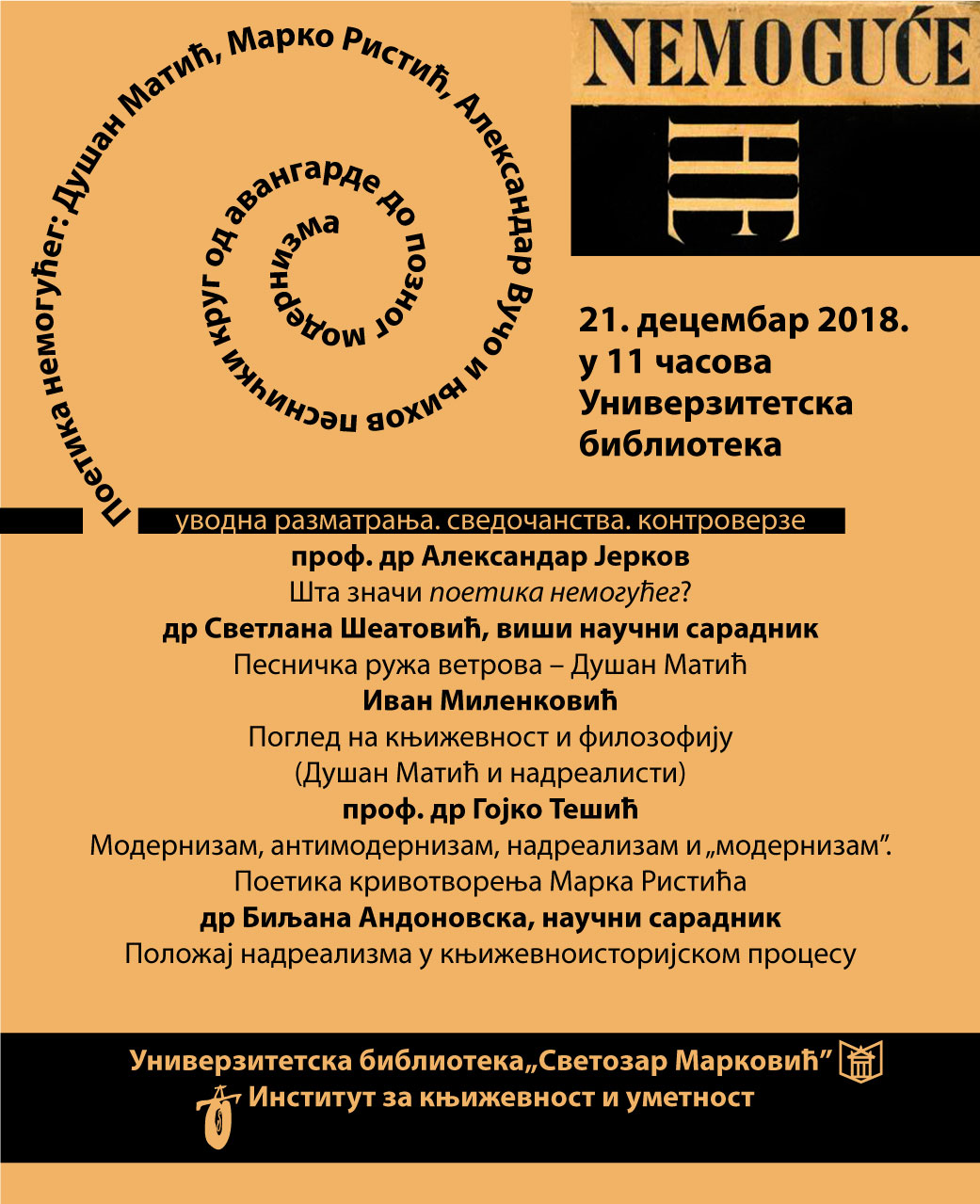 Институт за књижевност и уметност у сарадњи са Универзитетском библиотеком „Светозар Марковић” у оквиру пројекта "Смена поетичких парадигми у српској књижевности 20. века – национални и европски контекст" организује научни скуп посвећен надреализму. Скуп под називом "Поетика Немогућег: Душан Матић, Александар Вучо и Марко Ристић и њихов песнички круг од авангарде до позног модернизма" састоји се из два дела. Први део посвећен је уводним разматрањима која ће 21. децембра са почетком у 11 часова у просторијама Универзитетске библиотеке изложити: проф. др Александар Јерков управник библиотеке, др Светлана Шеатовић виши научни сарадник и руководилац пројекта, филозоф и преводилац Иван Миленковић, проф. др Гојко Тешић, др Биљана Андоновска научни сарадник. Други део скупа одржаће се 21. и 22. фебруара 2019. године. Говорници ће 21. децембра, припремног радног дана, проблематизовати низ књижевноисторијских питања и естетичко-теоријских аспеката београдског надреалистичког круга. Уводни разговори водиће се уз увид у одабрани архивски видео и аудио материјал о песницима поменутог правца.