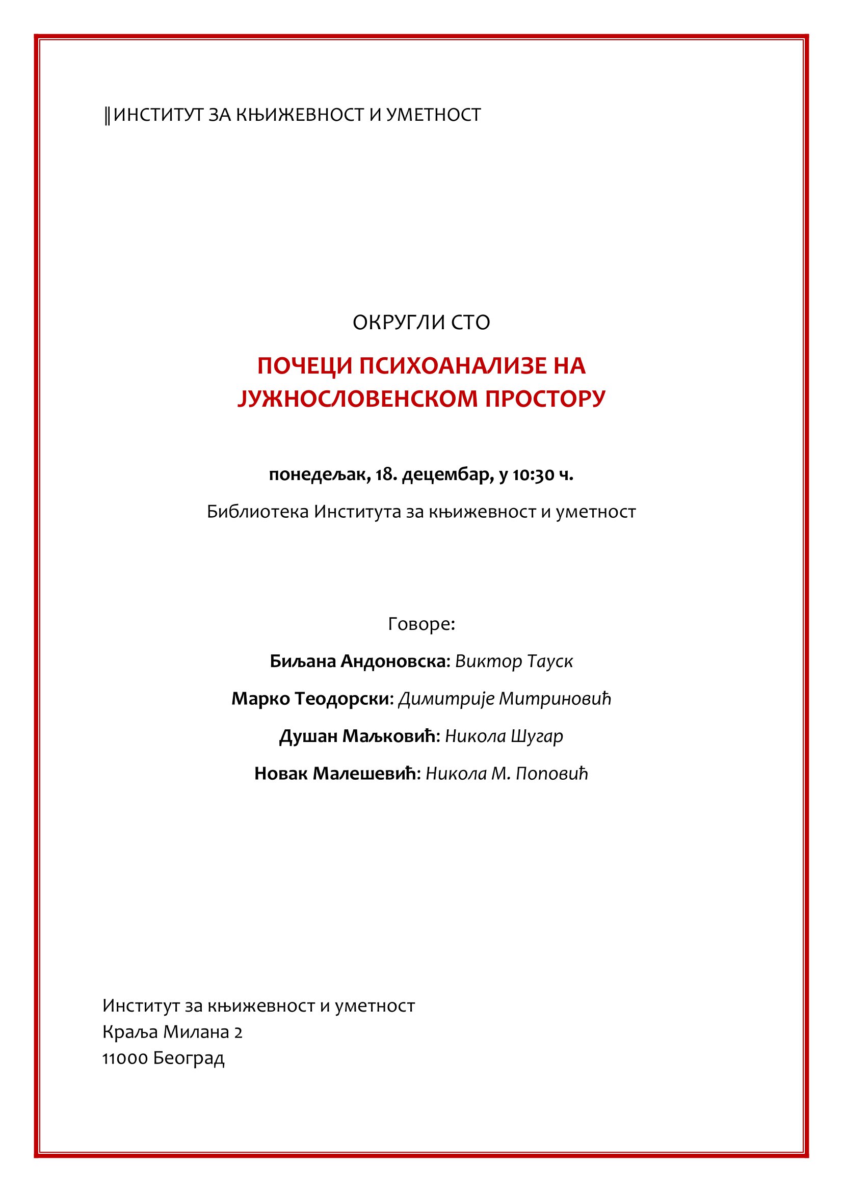 У понедељак 18. децембра, с почетком у 10:30 часова, у Библиотеци Института за књижевност и уметност биће одржан округли сто „Почеци психоанализе на јужнословенском простору“.