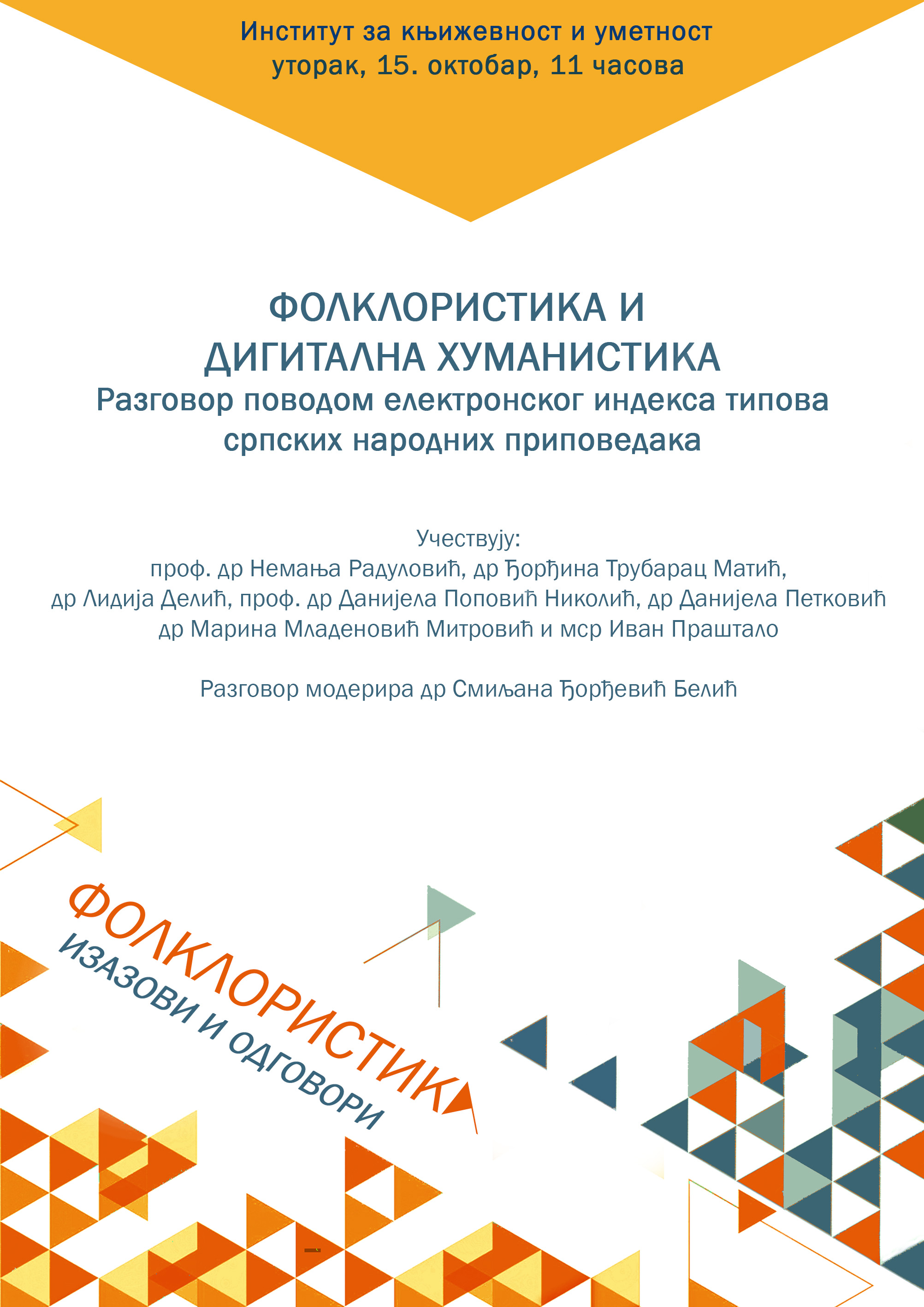 Повод за разговор Фолклористика и дигитална хуманистика је недавно објављен дигитални индекс српских народних приповедака. Осим представљања индекса, у чијем су се креирању ангажовали проф. др Немања Радуловић (Филолошки факултет, Београд), др Марина Младеновић Митровић (Институт за књижевност и уметност, Београд) и мср Иван Праштало (Филолошки факултет, Београд), учесници ће изнети досадашња искуства у коришћењу дигиталних технологија као научних алата. О раду на пољу дигиталне хуманистике говориће др Ђорђина Трубарац Матић (Етнографски институт САНУ), др Лидија Делић (Институт за књижевност и уметност, Београд), проф. др Данијела Поповић Николић (Филозофски факултет, Ниш) и др Данијела Петковић (Институт за књижевност и уметност, Београд). Разговор ће модерирати др Смиљана Ђорђевић Белић.