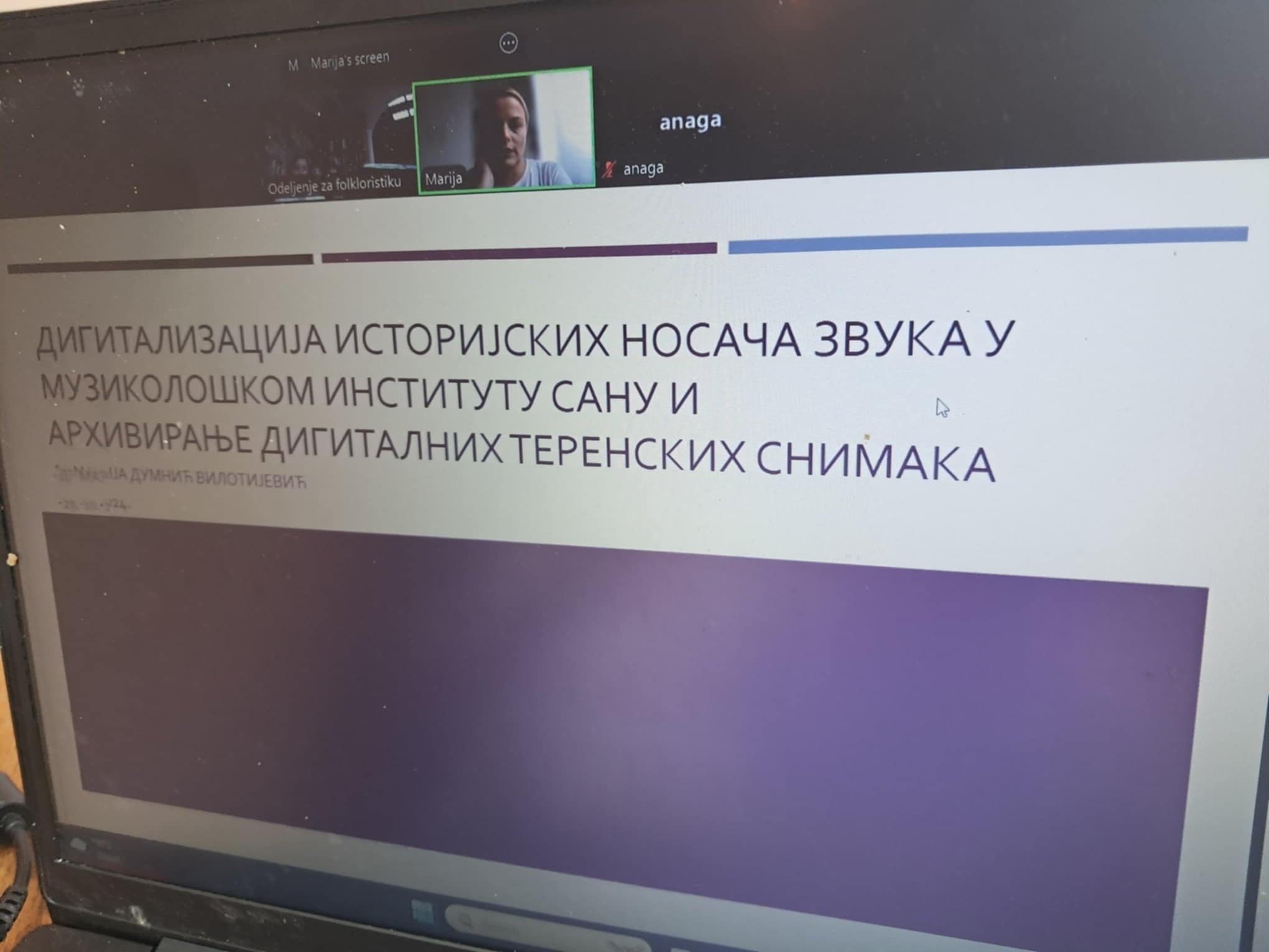 Др Данка Лајић Михајловић осветлила је вишедеценијска искуства захтевног рада на заштити и дигитализацији архивске грађе Музиколошког института (од воштаних и шелак плоча, преко магнетофонских снимака, до колекције комерцијалних издања, као и активности везане за дигитализацију пратећих материјала у папирном облику, где се као нарочито занимљива издваја, рецимо, архивска документација Савеза удружења фолклориста Југославије), уз изношење низа запажања о проблемима и изазовима са којима се и сама суочавала. Др Марија Думнић Вилотијевић осврнула се на сопствена искуства учешћа у поменутим активносима, уз посебно дискутовање будућих задатака – уједначавање система каталогизације, изазове поштовања етичких принципа у истраживању и различитим облицима презензације грађе (од правног регулисања проблема доступности грађе за коришћење, преко комплексности рада на објављивању научних и комерцијалних аудио и аудио-визуелних материјала). Др Лајић Михајловић и др Думнић Вилотијевић говориле су и о изразитој укључености дигиталне хуманистике у активности пројекта Applied Musicology and Ethnomusicology in Serbia: Making a Difference in Contemporary Society фонда за науку (програм Идеје), на ком су ангажоване. Др Светлана Ћирковић дала је пресек, сада већ више од две деценије дуге, историје настанка Дигиталног архива Балканолошког института САНУ (ДАБИ), од почетних теренских истраживања и иницијатива др Биљане Сикимић, до сагледавања актуелног стања и статуса овог архива пред чији се даљи потенцијални развој као посебно захтевни постављају проблеми систематизације и допуњавања метаподацима изузетно обимног материјала. Др Ћирковић је представила и начине архивирања грађе пројекта Vulnerable Languages and Linguistic Varieties in Serbia Фонда за науку Републике Србије (програм Идеје), те говорила о изазовима осмишљавања сврсисходног и за кориснике практично употребљивог начина каталогизације различитих облика аудио грађе и пратећих података и фото материјала.