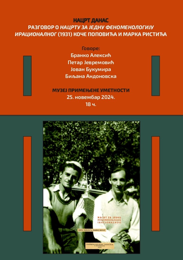 У склопу обележавања стогодишњице надреализма, у Музеју примењене уметности 25. новембра у 18 часова разговараћемо о Нацрту за једну феноменологију ирационалног (1931) Коче Поповића и Марка Ристића. На округлом столу о овом драгоценом примеру авангардне теоријске прозе учествоваће Бранко Алексић, Петар Јевремовић, Јован Букумира и Биљана Андоновска, која ће и модерирати разговор.