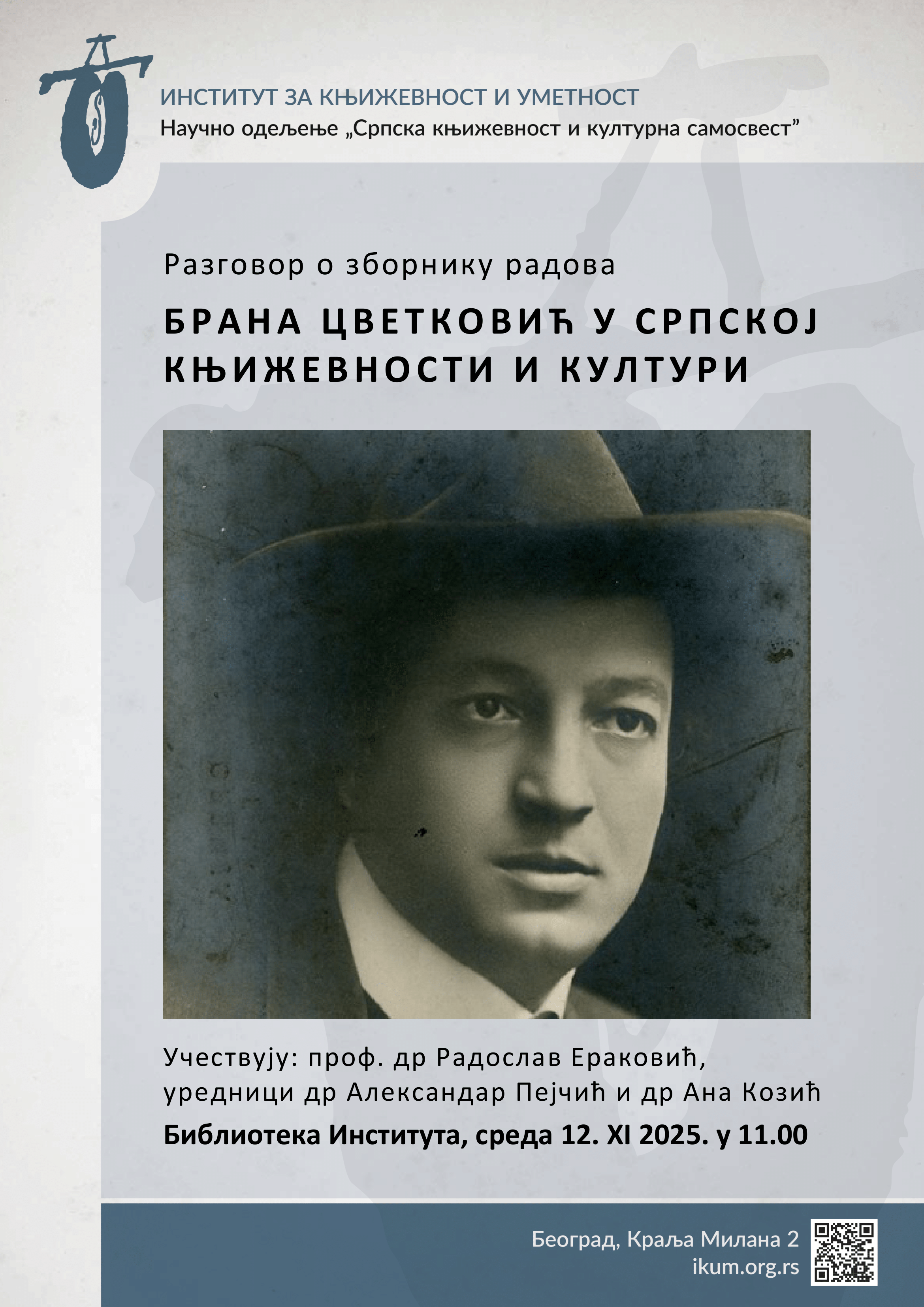 Позивамо Вас на разговор о научном зборнику Брана Цветковић у српској књижевности и култури (ур. др Александар Пејчић, др Ана Козић), који ће се одржати 12. новембра у 11 часова у библиотеци Института за књижевност и уметност. Зборник представља резултат научног скупа одржаног 18. и 19. новембра 2024. године у организацији одељења Српска књижевност и културна самосвест. О зборнику ће говорити проф. др Радослав Ераковић и уредници.