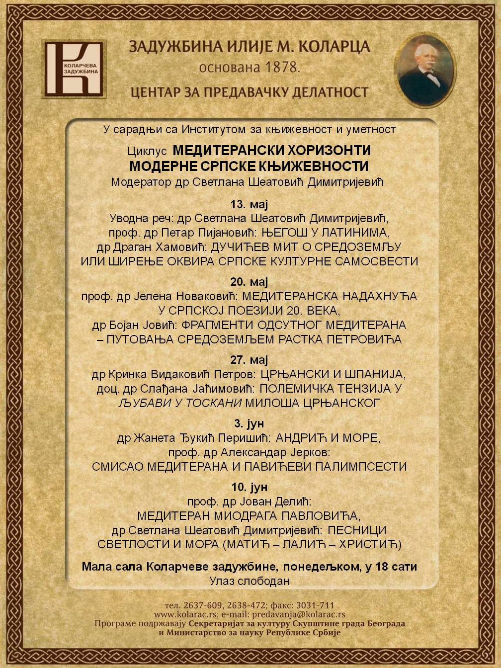 Пројекат Смена поетичких парадигми у српској књижевности ХХ века: национални и европски контекст организује циклус предавања Медитерански хоризонти модерне српске књижевности на Коларцу од 13. Маја до 10 . јуна. Циклус предавања је саставни део међународног зборника радова Acqua alta – Медитерански пејзажи у модерној српској и италијанској књижевности, који објављује Институт за књижевност и уметност и Универзитет у Пескари. Уреднице овог зборника су др Светлана Шеатовић Димитријевић, проф. др Марија Рита Лето и др Персида Лзаревић Ди Ђакомо. Модератор циклуса је др Светлана Шеатовић Димитријевић. |